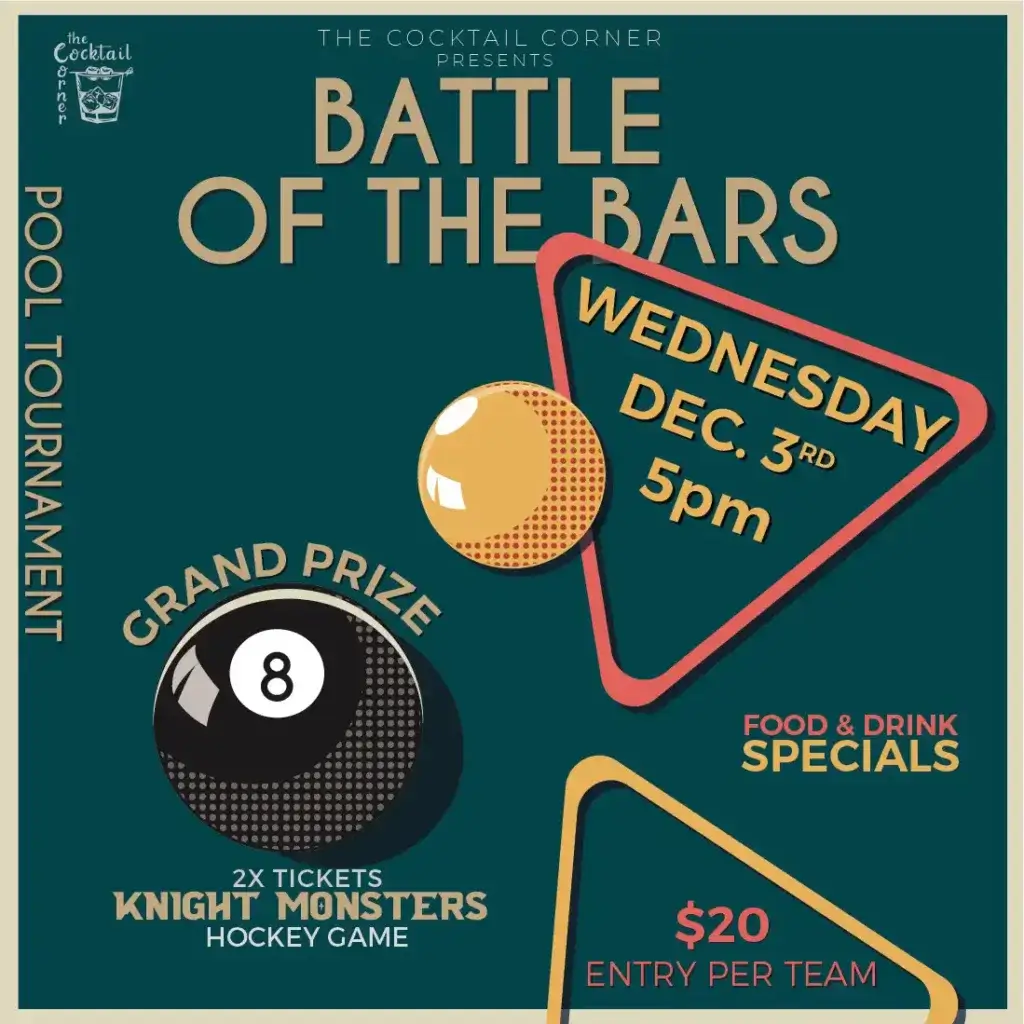 Battle of the Bars! Think your team’s got what it takes? Join us Dec 3rd at 5PM for our Billiards Tournament! $20 entry per team. Winners take home 2 Knight Monster tickets! Bring your best game — bragging rights are on the line.