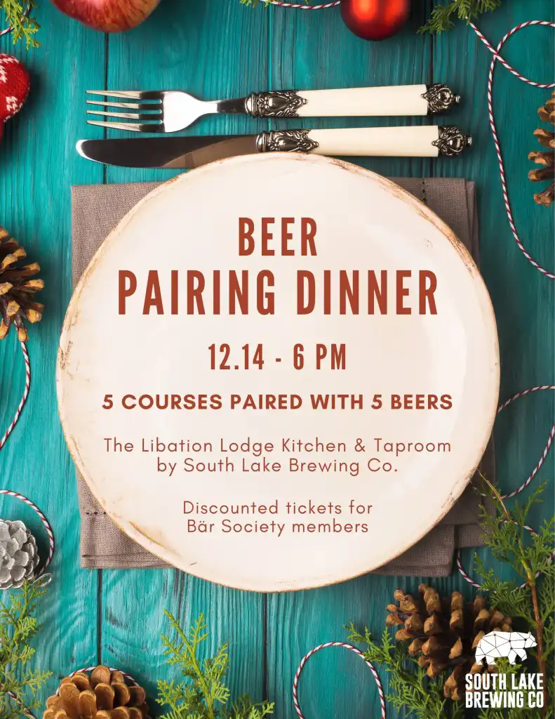 You’re invited to our annual Beer Pairing Dinner on Sunday, December 14th, at South Lake Brewing Company’s Libation Lodge Kitchen & Taproom!