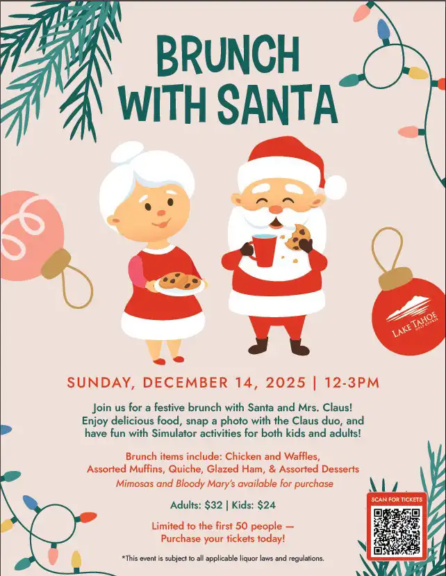 Join Santa and Mrs. Claus for their annual brunch in the Clubhouse at Lake Tahoe Golf Course on December 14 from 12:00 to 3:00 pm. This event is fun for all ages and will include kids’ craft activities as well as family games on the clubhouse simulators.