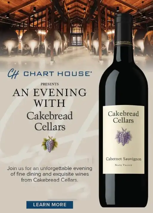 For the menu and more information, please visit https://www.chart-house.com/event/cakebread-cellars-wine-dinner/.