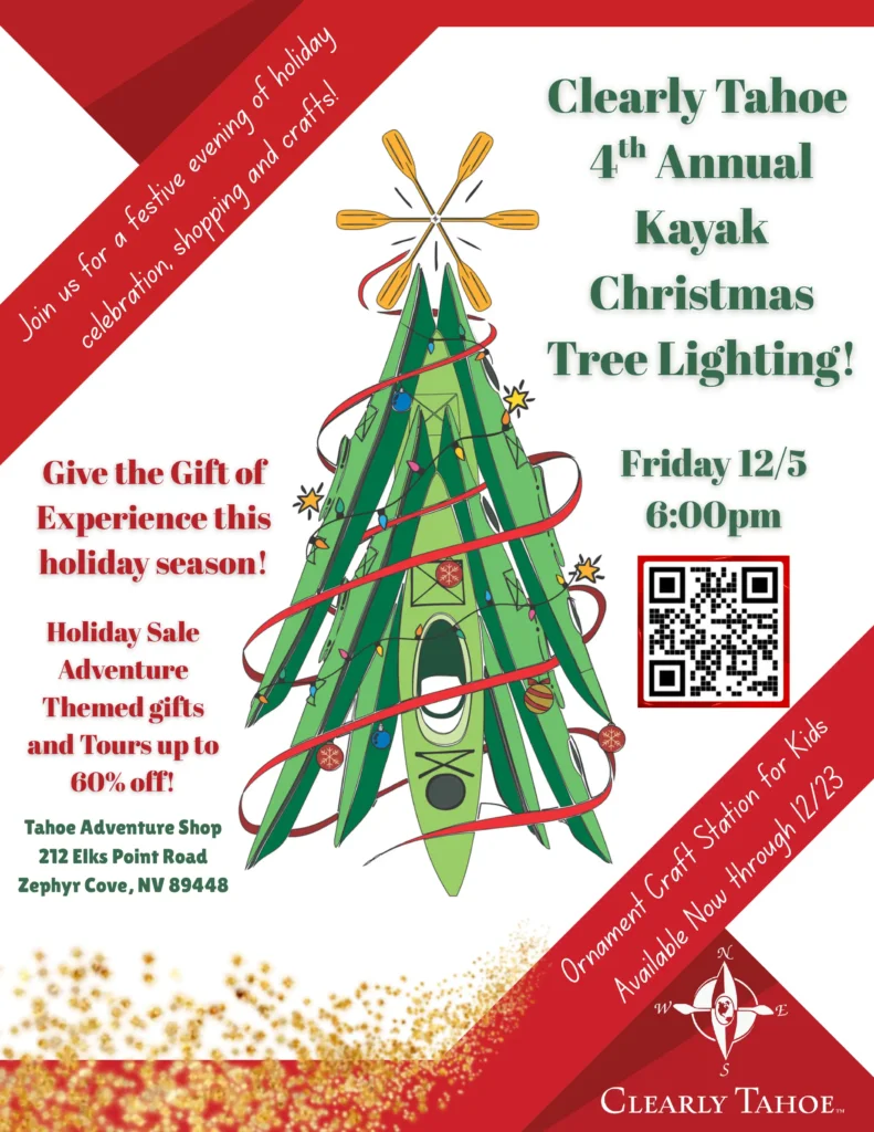 Clearly Tahoe will be hosting the 4th annual Christmas Tree Lighting, Friday, December 5th, at the Clearly Tahoe Adventure Shop in Round Hill Plaza, Zephyr Cove. The event will feature a 12-foot-tall Christmas tree made entirely out of kayaks, ornament making for kids, and photo opportunities for the whole family. It’s a wonderful way for guests and locals to celebrate the season together and escape the cold.