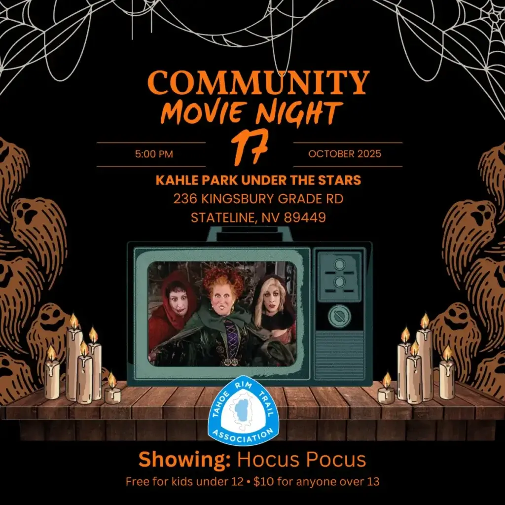 Get ready for a magical evening under the stars! Join us for Community Movie Night on Friday, October 17 at Kahle Park, featuring a special outdoor screening of Disney’s classic Hocus Pocus. Bring your blankets, lawn chairs, family, and friends for a cozy night of Halloween fun in a beautiful Tahoe setting.