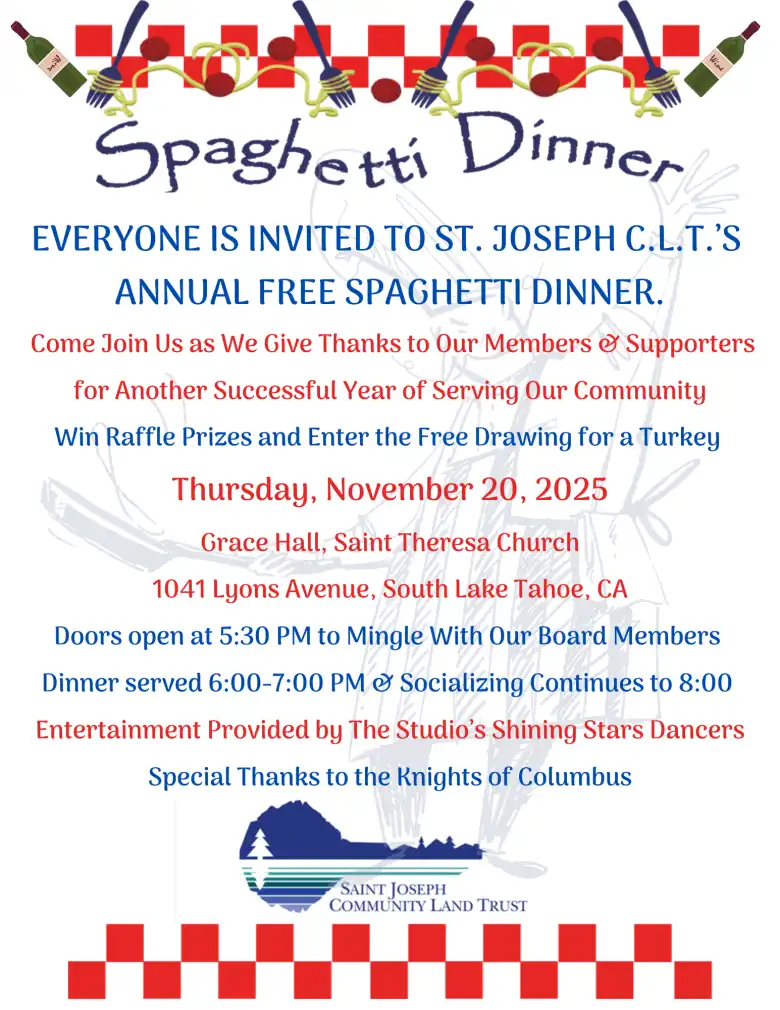 Thursday, November 20, 2025, 6:00 – 7:00 pm. Join your friends and neighbors for the annual free pre-Thanksgiving Spaghetti Dinner hosted by the St. Joseph Community Land Trust (SJCLT) on Thursday, November 20. They had an incredible year and would love the opportunity to thank their members and community for their support.