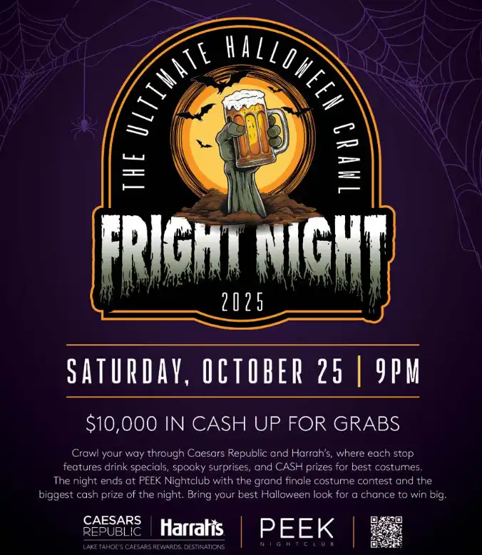 Fright Night returns to Caesars Republic & Harrah’s Lake Tahoe for its second annual Halloween celebration on Saturday, October 25, 2025. Following the success of last year’s debut, this year’s Halloween crawl will once again feature themed venues, live DJs, specialty cocktails, and $10,000 in cash prizes.