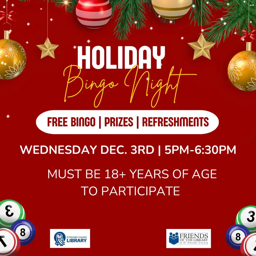 Wednesday, December 3, 2025, 5:00 pm, Holiday Bingo Night at the South Lake Tahoe Library.