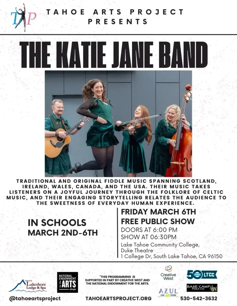Friday, March 6, 2026, The Katie Jane Band in the Duke Theatre at the Lake Tahoe Community College. Free Public Performance. Donations Accepted. Doors open at 6:00 pm.