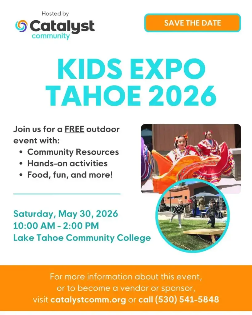 Saturday, May 30, 2026, 10:00 am – 2:00 pm, Kids Expo Tahoe at the Lake Tahoe Community College. This is a free event for kids and families with community resources, free activities for kids, performances, food, and much more. If you are interested in participating as a vendor, sponsor, performer, or another role, please call our office at (530) 541-5848.