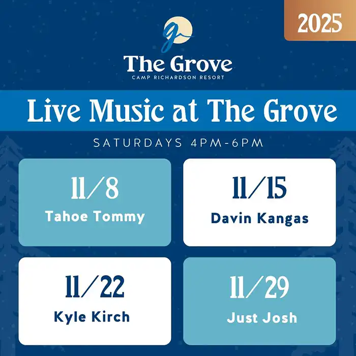 Welcome to The Grove at Camp Richardson Resort. Located on the beach just steps from the lake, The Grove offers expansive Lake Tahoe views, a casual ambiance, and indoor and outdoor (seasonal) dining. Our award winning Chef has created a creative family-friendly menu with tasty bites, unique entrees, sumptuous desserts, and a slew of cocktails and mocktails to quench your thirst. Check out our menu and join us for an unrivaled experience in the restaurant or the bar.