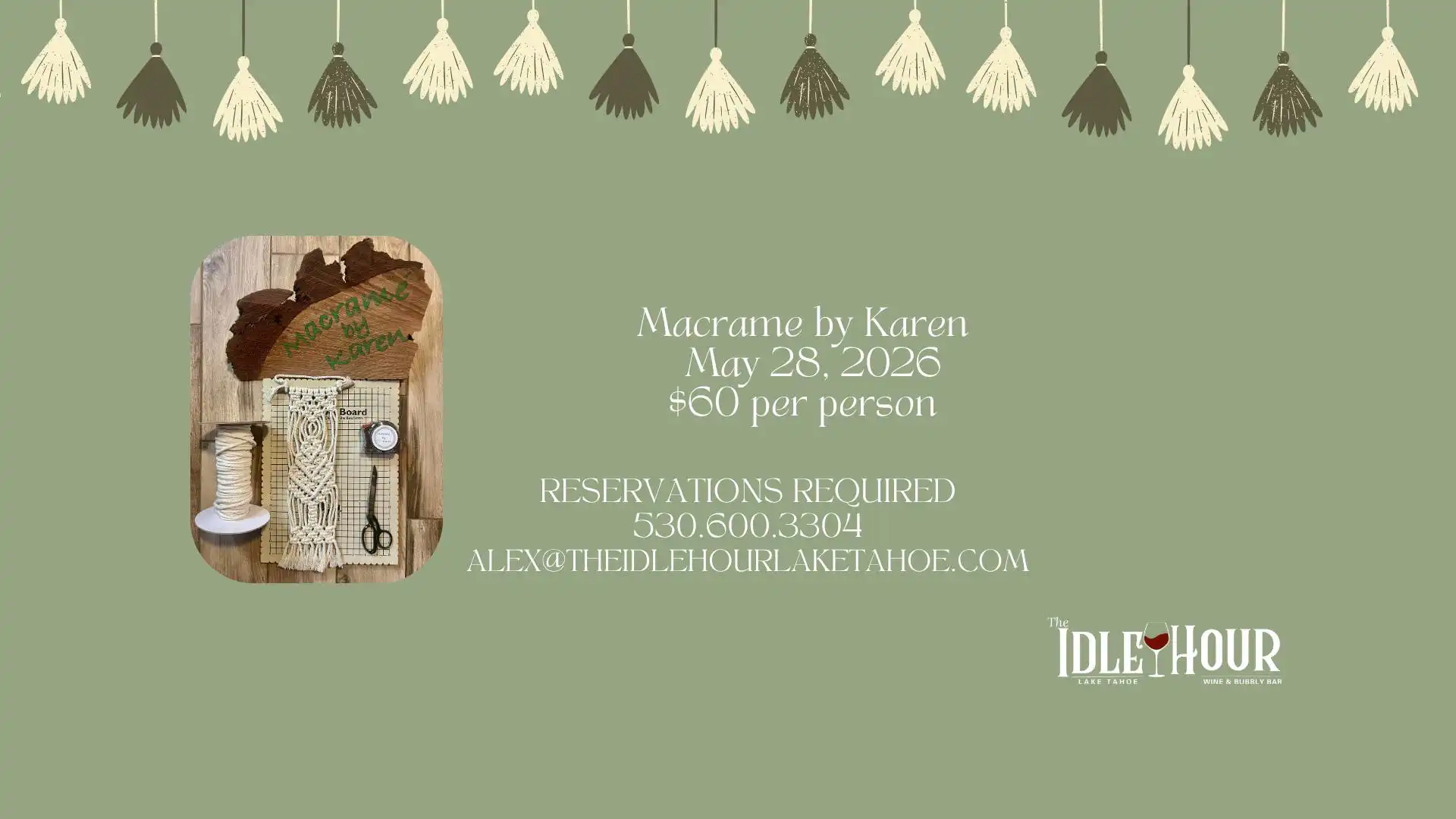 Thursday, May 28, 2026, Learn to macrame! Reservations are required. Email: Alex@theidlehourtahoe.com. Phone: 530-600-3304