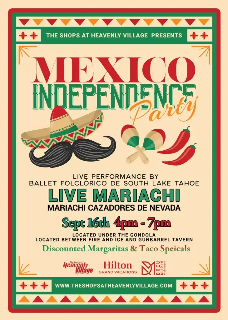 Tuesday, September 16, 2025, 4:00 – 7:00 pm. Mexico Independence Celebration at the Heavenly Village Lake Tahoe. Live Mariachi. Discounted margaritas and taco specials. Located under the Gondola between Fire and Ice and Gunbarrel Tavern.