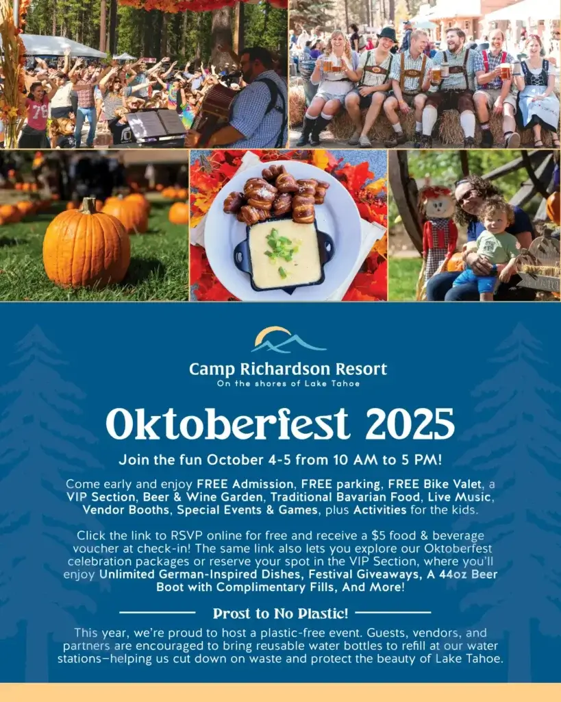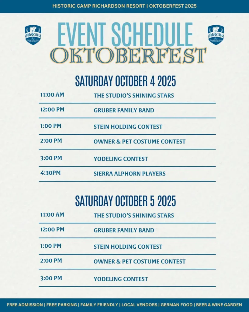 Oktoberfest at Lake Tahoe – the yearly celebration of all things German – will return to Camp Richardson Resort on October 4 & 5, 2025.