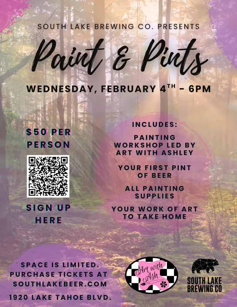 Your $50 ticket includes all painting materials, your first pint of beer, and instructions. The event starts at 6 PM at our Brewery location at 1920 Lake Tahoe Blvd.