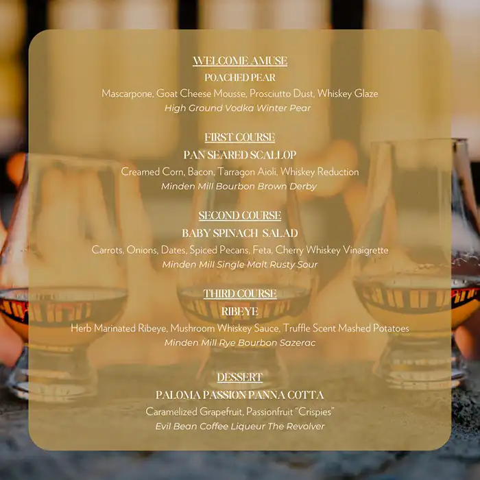 Indulge in an unforgettable evening featuring the core spirits of Minden Mill Distilling, complemented by a specially curated menu. We are thrilled to be featuring from their series, historic insights, and passion for these exceptional spirits, alongside the master ambassador himself, Lucus Huff, as our guest of honor.