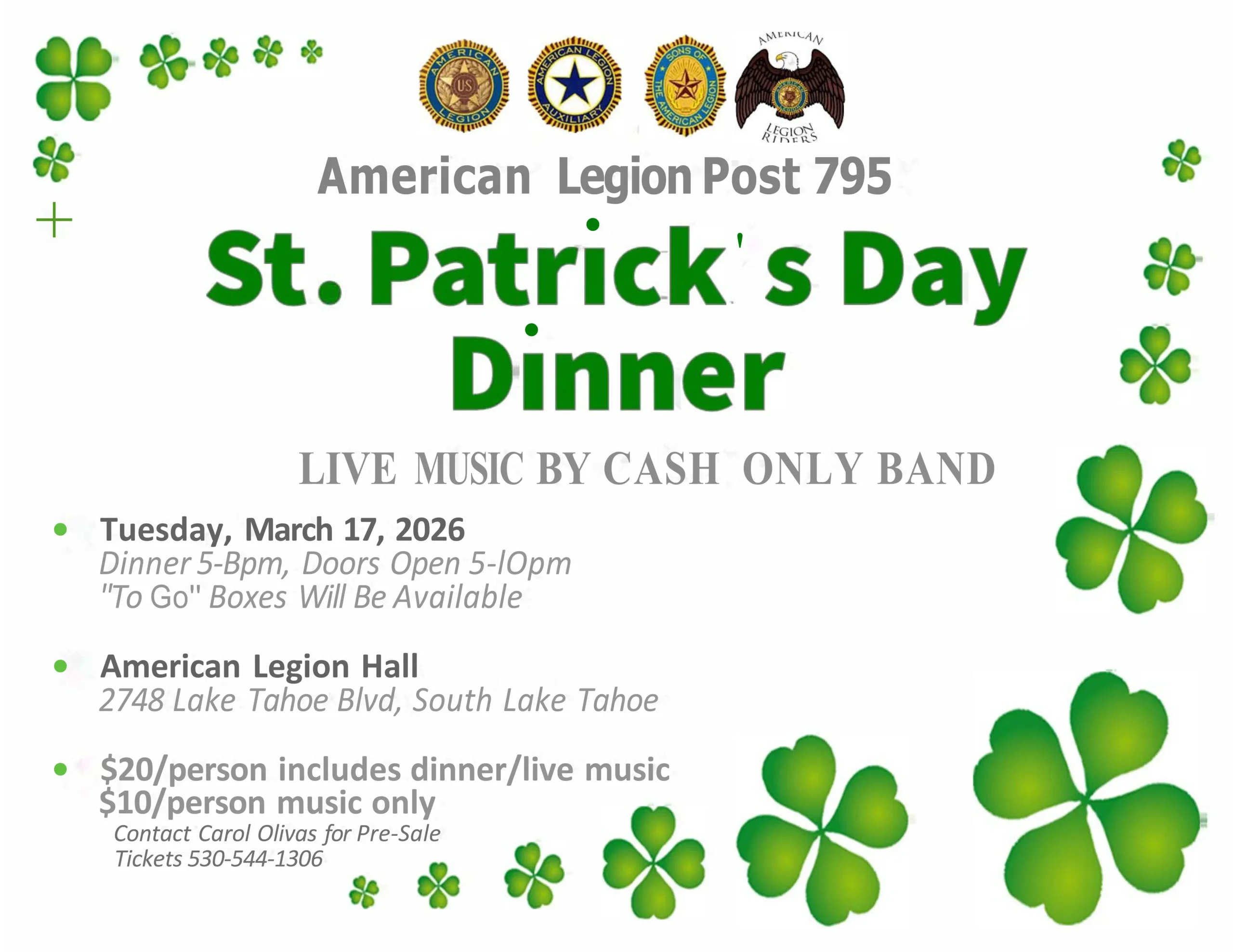 March 17, 2026. The American Legion Hall is located at 2748 Lake Tahoe Boulevard in South Lake Tahoe.