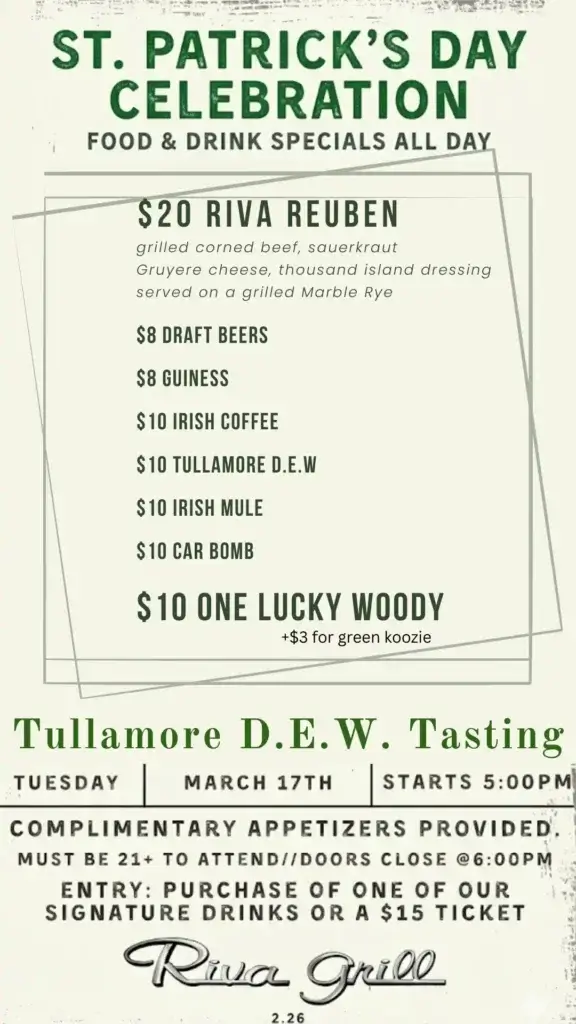 St. Patrick’s Day Celebration at the Riva Grill on the Lake. Food and drink specials all day. Tullamore D.E.W. Irish Whiskey Tasting at 5:00 pm.