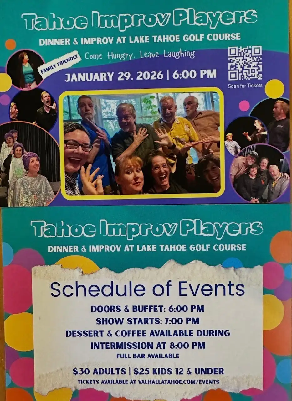 Thursday, January 29, 2026, Dinner and Improv at the Lake Tahoe Golf Course. Come hungry. Leave laughing.