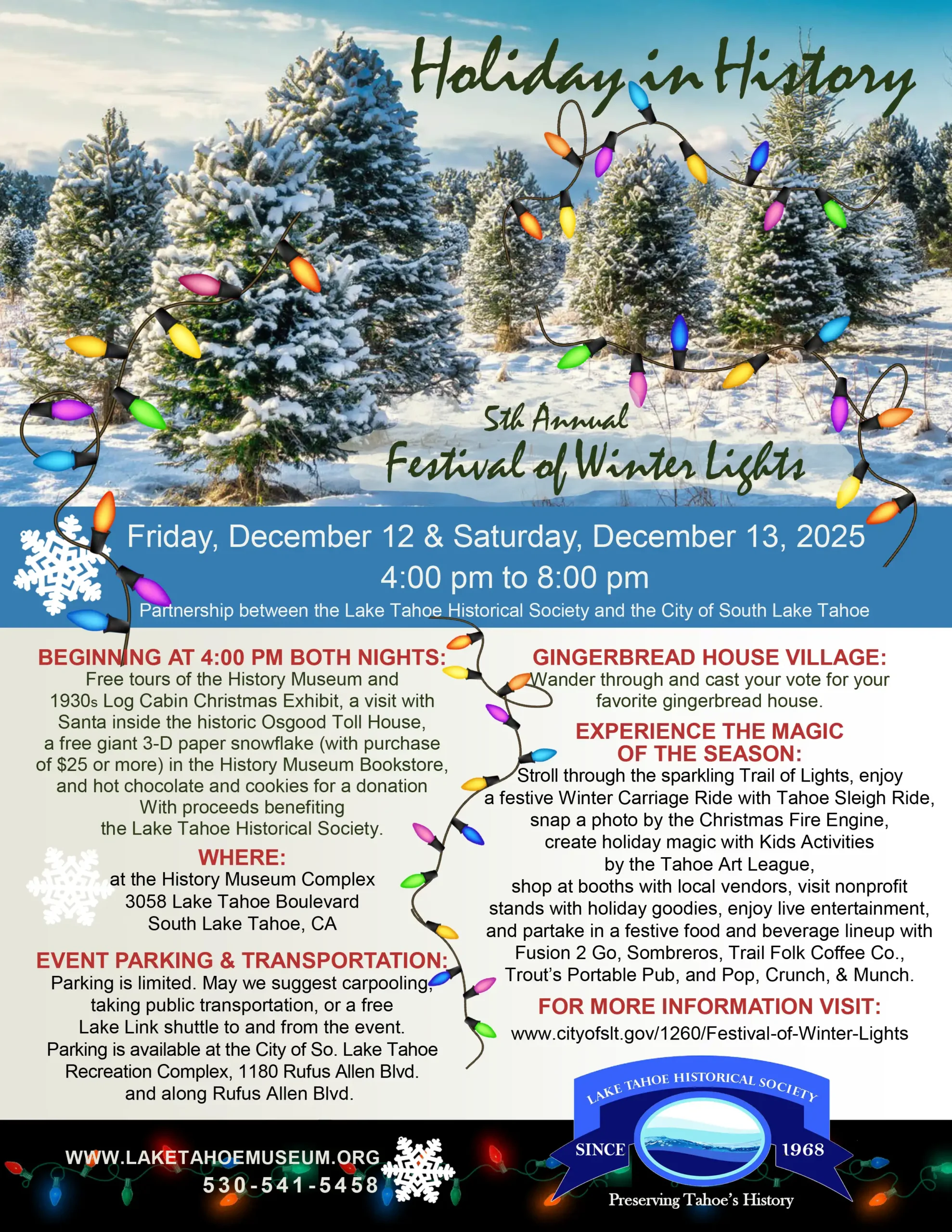 The City of South Lake Tahoe and the Lake Tahoe Historical Society have teamed together once again for the 5th annual Festival of Winter Lights on Friday, December 12 and Saturday, December 13 from 4 p.m. to 8 p.m. nightly. The museum and its bookstore will be holding its Holiday in History during the festival and will be open from 4 p.m. to 8 p.m. Friday, and 11 a.m. to 8 p.m. Saturday.