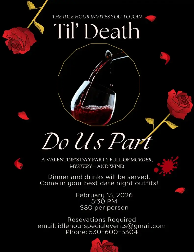 The Idle Hour invites you to Til Death Do Us Part — a Valentine’s Day Murder Mystery Dinner filled with intrigue, twists, and wine. Friday, February 13, 2026, 5:30 pm. $80
