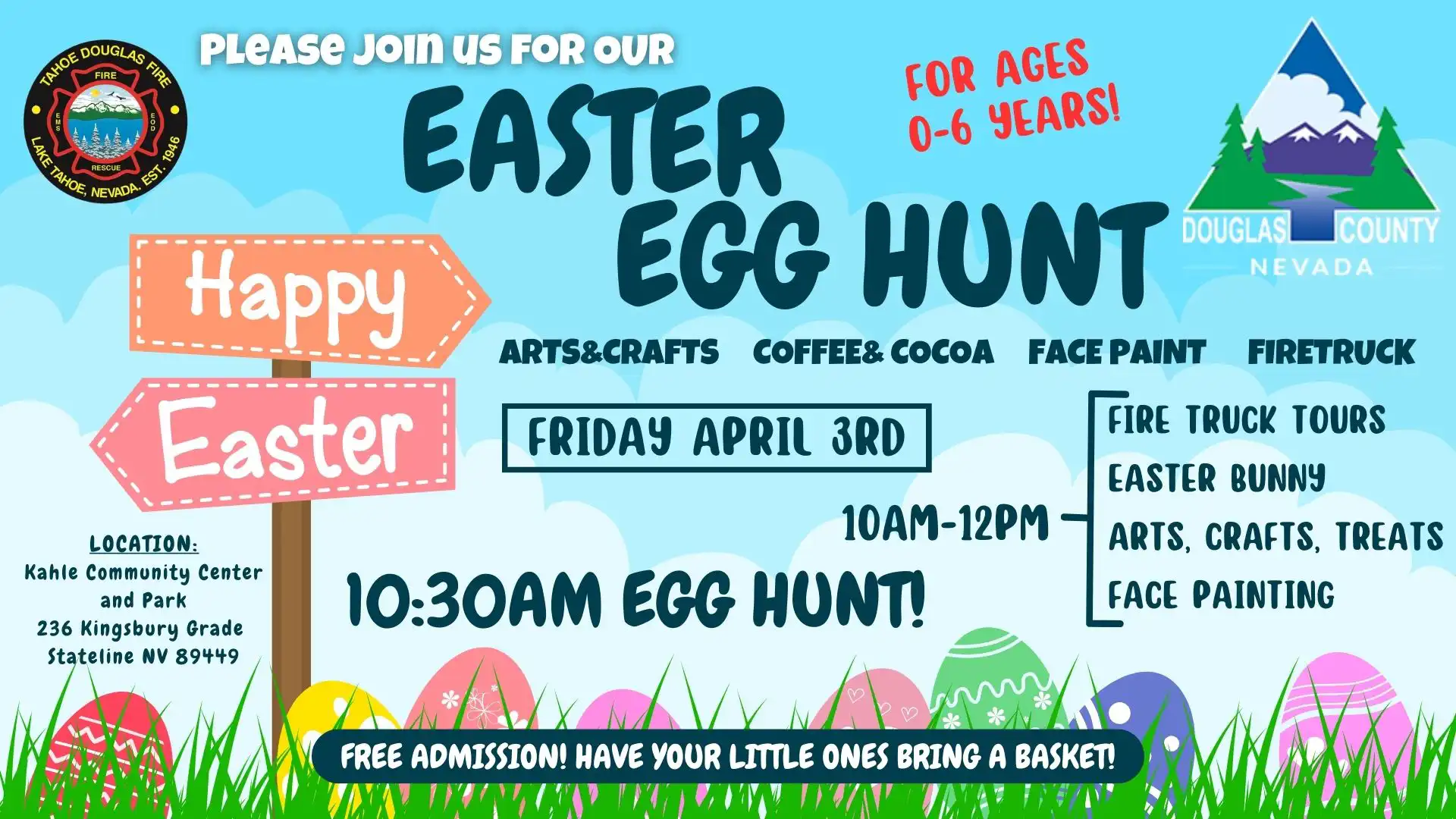 Friday, April 3, 2026, Co-Sponsored by the Tahoe Douglas Firefighter’s Association. Bring your little ones (0-6yrs of age) and their baskets to join in on the egg hunt and festivities at Kahle Community Park.