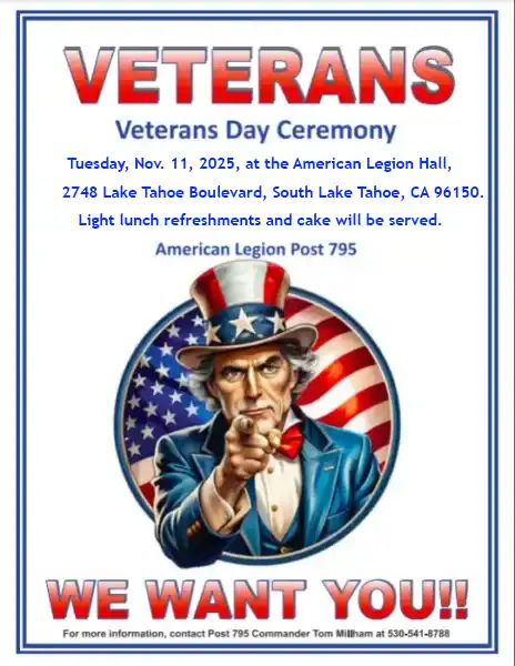 American Legion Post 795 of South Lake Tahoe invites community members to join the American Legion, American Legion Auxiliary, and Sons of the American Legion in honoring all veterans this Veterans Day.