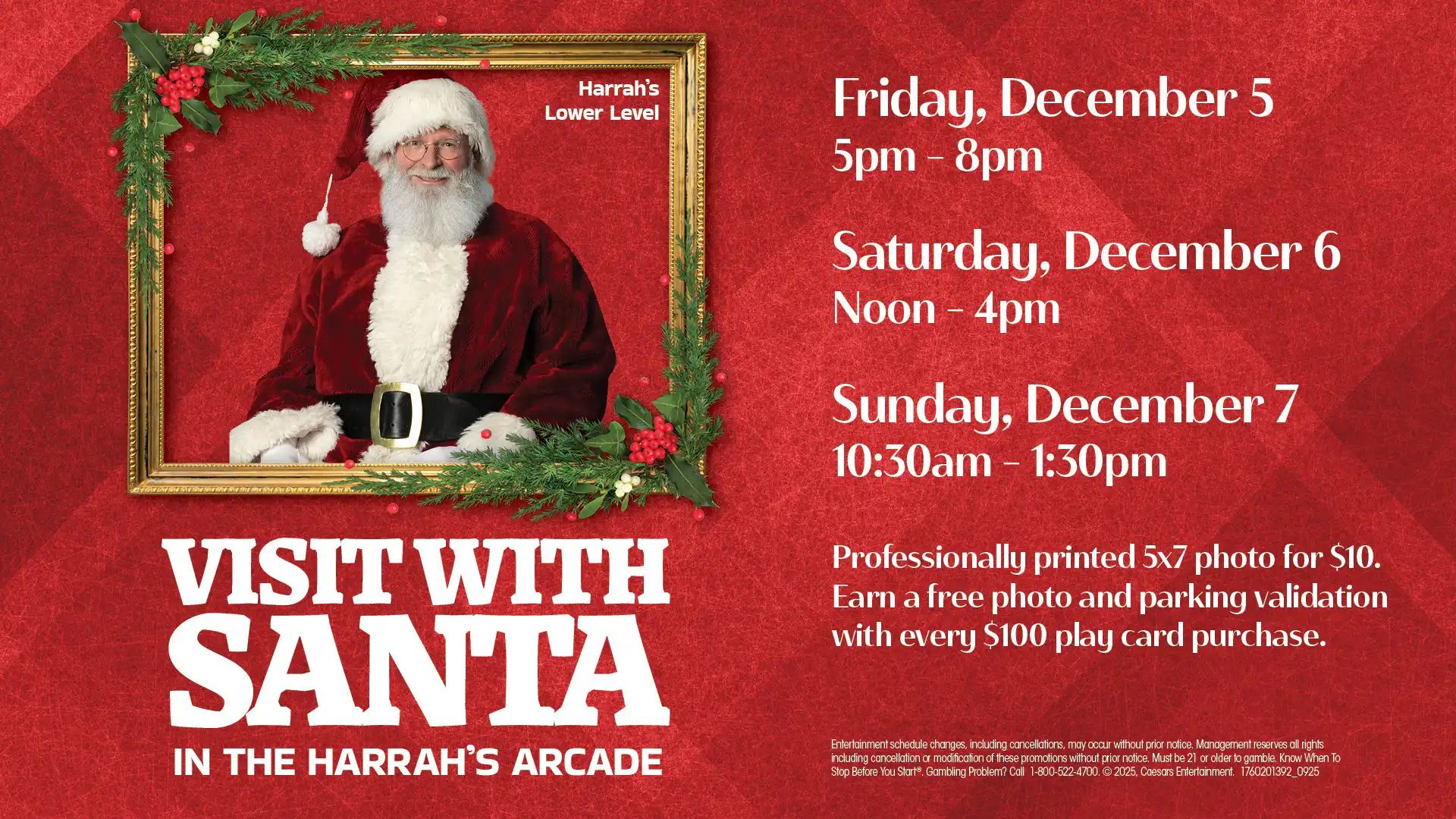 Make this holiday season unforgettable! Meet Santa in a family-friendly setting while enjoying the thrills of Harrah’s Arcade. Create lasting holiday memories and take home a keepsake photo.
