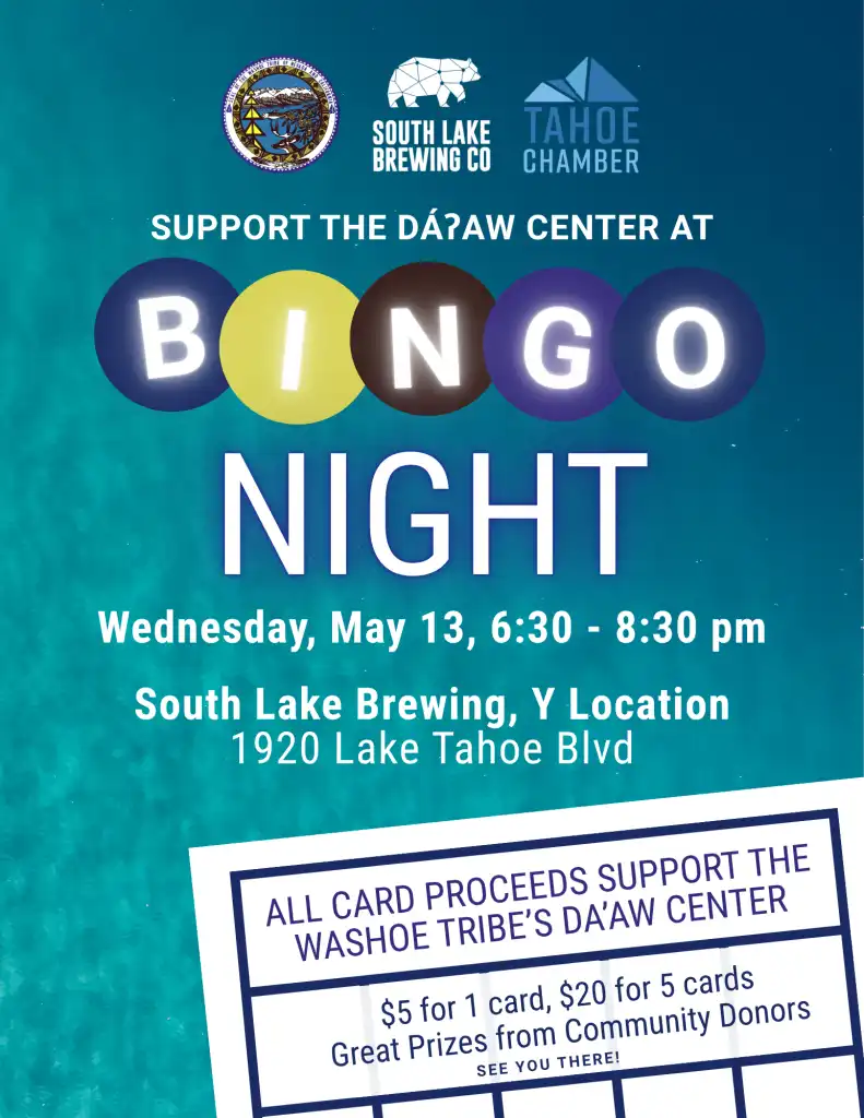Wednesday, May 13, 2026, 6:30 pm. Washoe Tribe Community Center at our Bingo Night Fundraiser at South Lake Brewing Company!