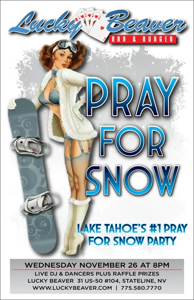 Wednesday, November 26, 2025, Pray for Snow Party at the Lucky Beaver Bar & Burger. The night’s festivities at The Lucky Beaver will include a live DJ starting at 9 pm, dancers, drink specials, and incredible prize giveaways. and more!