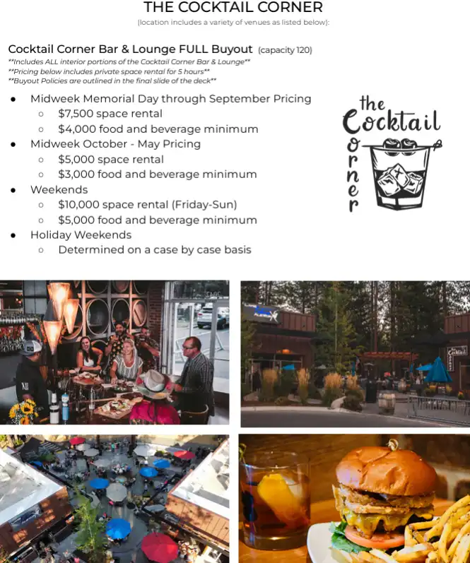 The AleWorX team proudly presents, The Tahoe Cocktail Corner! A mountain modern cocktail bar with an upscale casual atmosphere that specializes in cocktails and a contemporary casual assortment of food dishes that will rotate seasonally to keep it exciting!