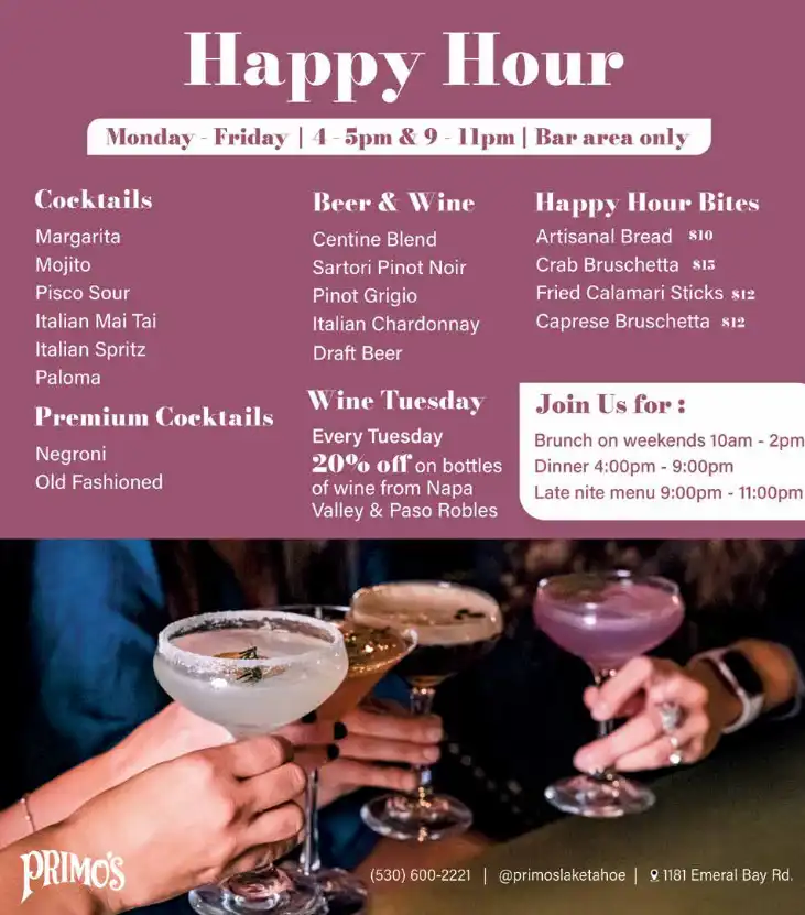 Primo’s Happy Hour, Monday through Friday, 4:00-5:00 and 9:00-11:00 pm in the bar area only.