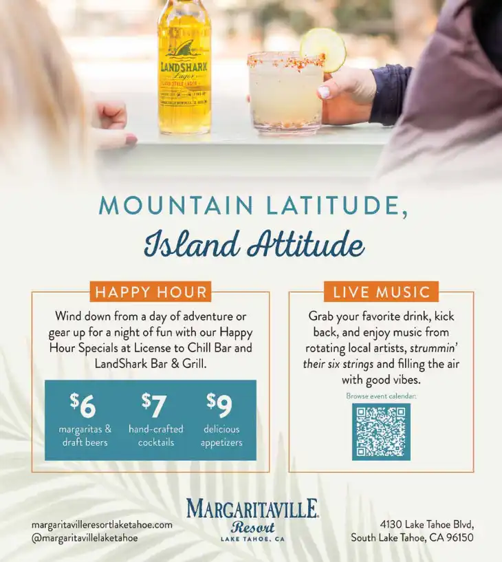 Happy Hour at LandShark Bar & Grill and Liscense to Chill Bar. Kick back, relax, and soak up the laid-back vibes during Happy Hour, Monday through Saturday from 3 PM – 5 PM! Sip on $6 Margaritas, enjoy $6 Draft Beers, and snack on $9 Appetizers while taking in the lively atmosphere. Whether you’re unwinding after a day of adventure or just looking for a reason to celebrate, there’s no better place to toast to good times. Cheers to island time in Lake Tahoe! Enjoy Live Music at License to Chill Bar every Thursday, Friday, and Saturday from 5-8pm.