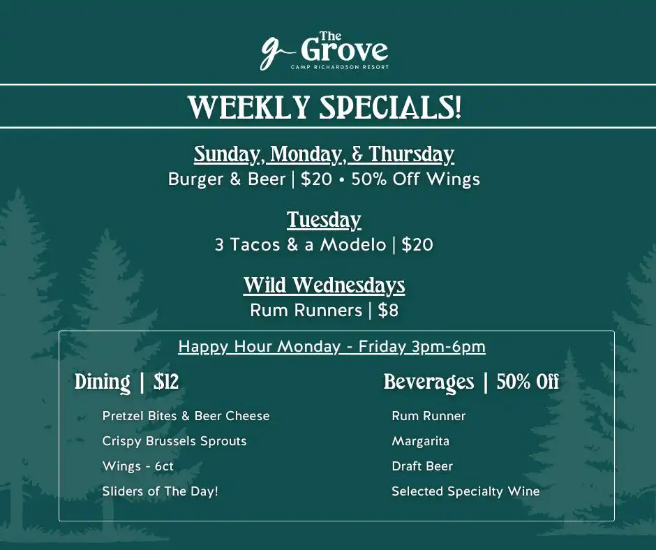 Happy Hour at the Grove Camp Richardson Resort – Happy Hour Monday-Friday, 3:00-6:00 pm, The Grove is giving happy hour a whole new meaning… you can’t afford to miss it!